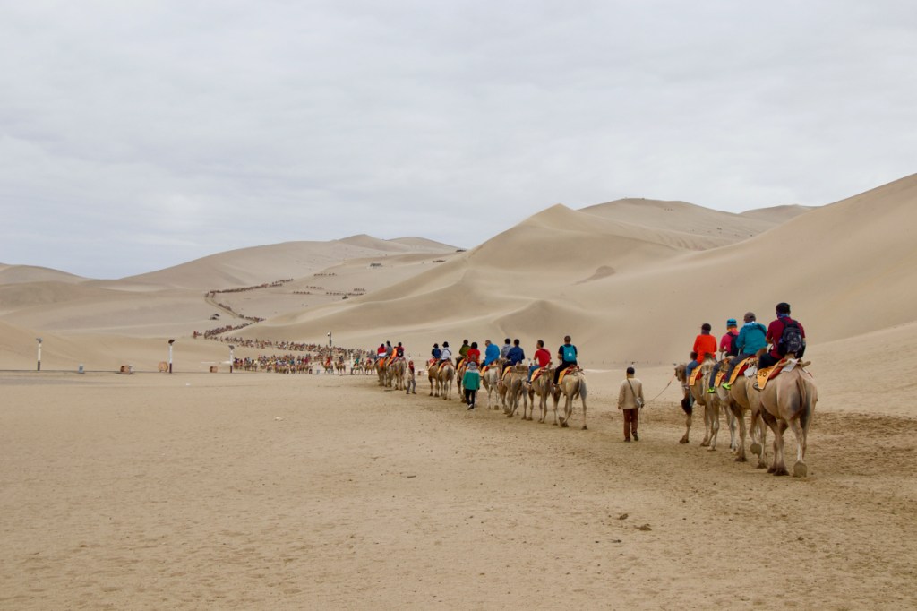 下午前往鳴沙山月牙泉,一進到園區就看到一排一排的駱駝在黃沙中漫步,園區內據說有一千三百多隻駱駝供遊客騎乘體驗,不過我們很能走而且要省錢,就決定自己一步一步爬上沙丘。除了駱駝以外,就是一大堆穿著亮橘色租借鞋套的遊客。當時天氣不太好,天上都是烏雲,也刮起一陣一陣的風,風吹起沙子打在腳上很痛。沙丘上有一條繩梯,可以沿著走上去,但是身為一個屁孩,我才不走繩梯咧,走在繩梯旁邊,走一步往後滑半步,在厚厚的沙子上走路真的非常費力。好不容易爬上沙丘,望著月牙泉,想像著古代商隊走在絲路上,停留在這黃沙之中小小一塊綠洲。鳴沙山據說是因為風向和沙子的關係,沙丘會發出聲音,但是就算當天風沙不小,我也沒有聽到鳴沙山到底是怎麼「鳴」的。