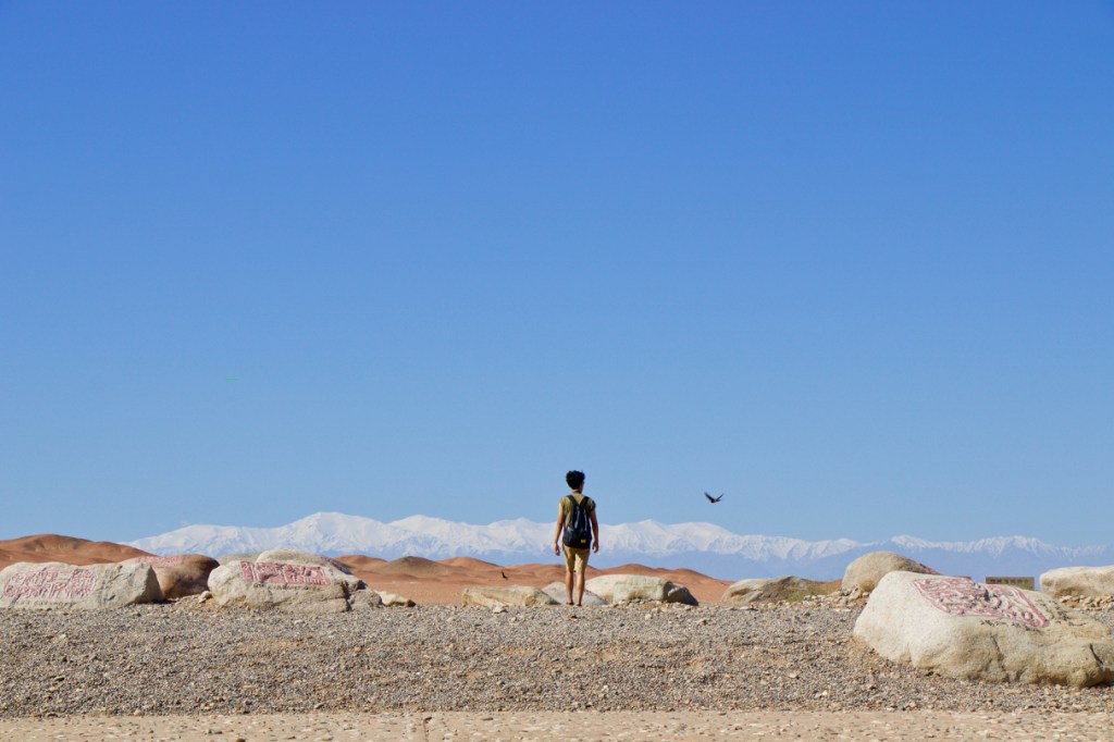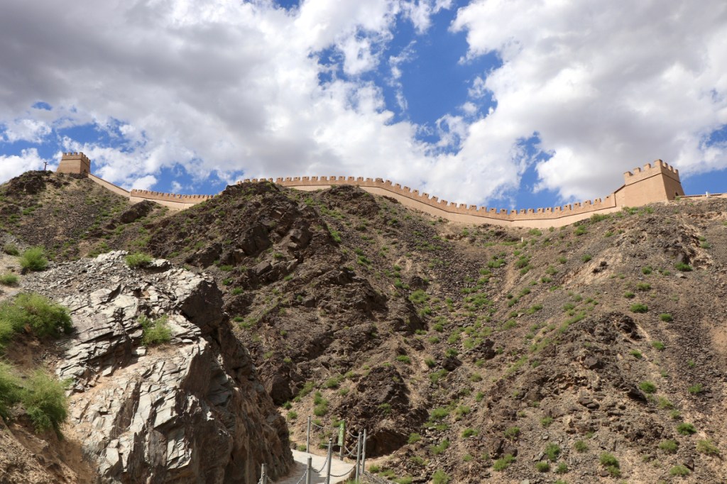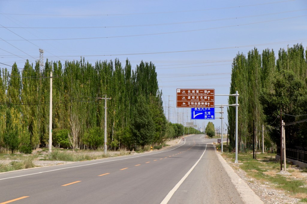 懸臂長城就是一小段長城,像一條手臂掛在山脊上,可以走上去,要爬一些樓梯,但是很短,最上面視野還不錯。長城旁邊的山坡上有許多石頭被拿來排字,應該可以走過去排字,但是要小心不要踩到大便。雖然只有短短一小段,但是它畢竟是長城的一部分,走在上面還是有一種很酷的感覺。接下來我們要去嘉峪關關城,因為不想花錢打車,而且我們很能走,所以就在豔陽下走了大概8公里,中間經過沙漠、農村、農田、市區,看到了不同於觀光區的一面。