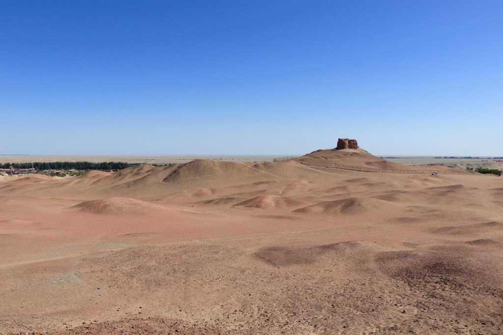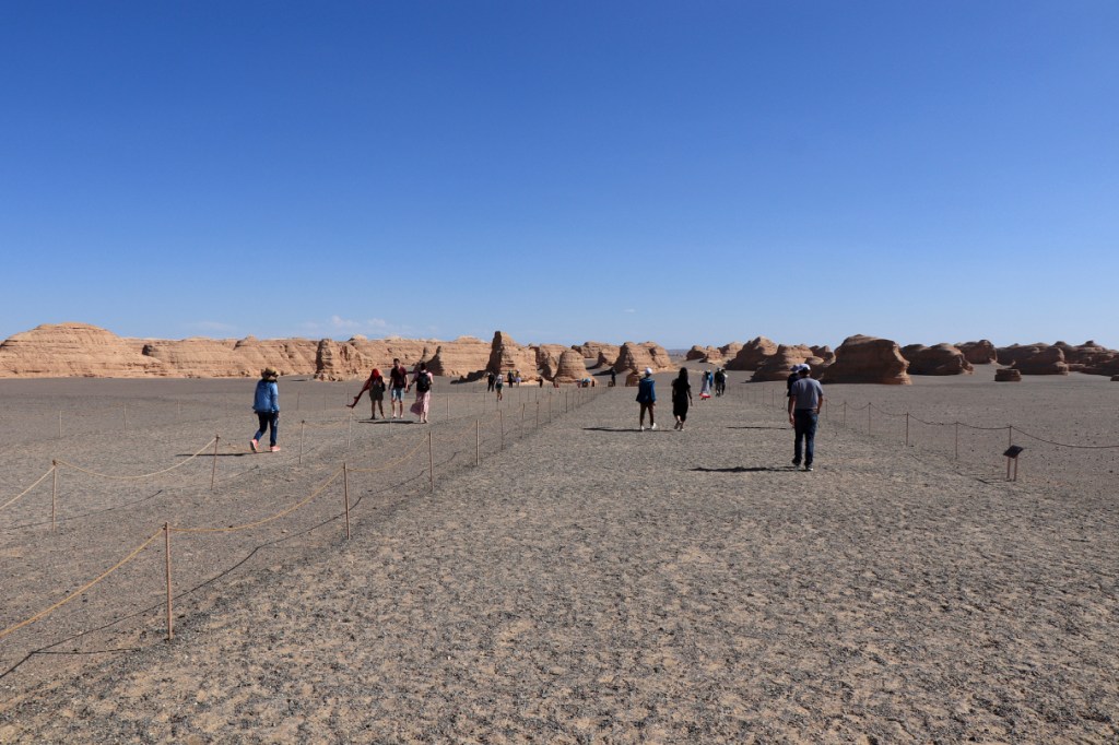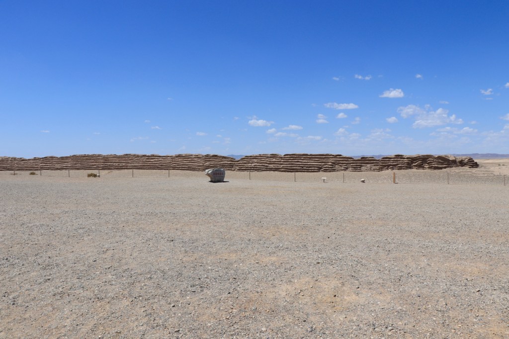 接下來前往玉門關景區,其中包括了小方盤城(玉門關)、大方盤城、漢長城,還有一個展覽館,小方盤城可以走路前往,在那還可以遠眺「洋水海子」,是一個名字很奇怪的湖。接下來搭乘園區內的遊覽車,前往大方盤城和漢長城,每個點僅停留一陣子,要自己記好上車時間和車牌號碼,不然被丟在大漠之中就完蛋了。大方盤城真的很大、很壯觀,有一條步道可以繞大方盤城一圈,從各個角度欣賞,但是豔陽高照,非常炎熱,且時間有限,所以很多人都沒有去走。漢長城年代非常久遠,只剩下矮矮的斷垣殘壁,但是能保存到現在還是很厲害了。