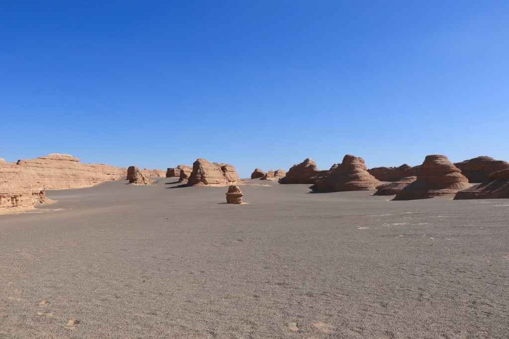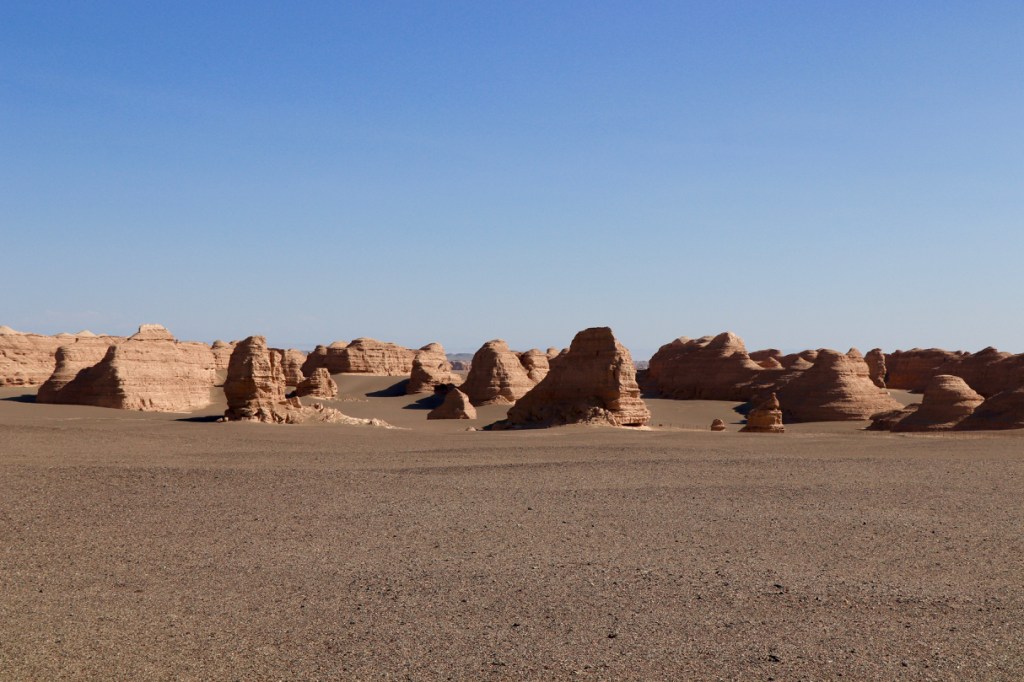下一站是距離最遠的雅丹地質公園,幾乎已經是甘肅省的邊緣,再過去就是新疆了。在景區內搭乘遊園車,欣賞雅丹地貌,是一種風蝕性地貌,在侵蝕的不同階段會有不同的樣貌,在一片黑色戈壁中,有一塊塊奇形怪狀的小丘,就是受到風侵蝕形成的。其中幾個點可以下車走走看看,在一望無際的大漠中,空蕩蕩的筆直公路拍起來別有一番風味。