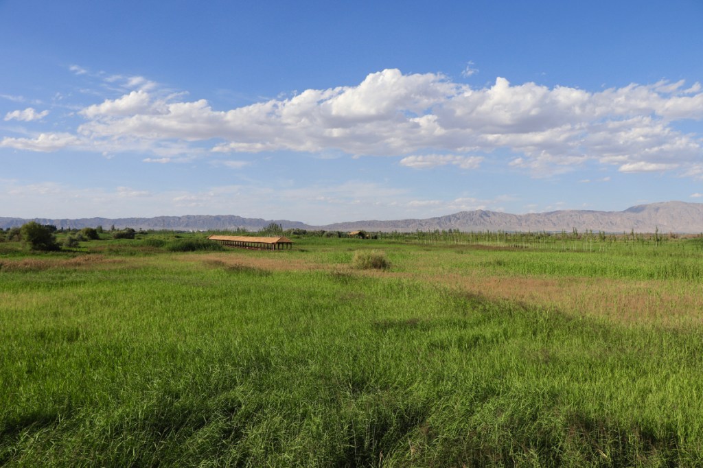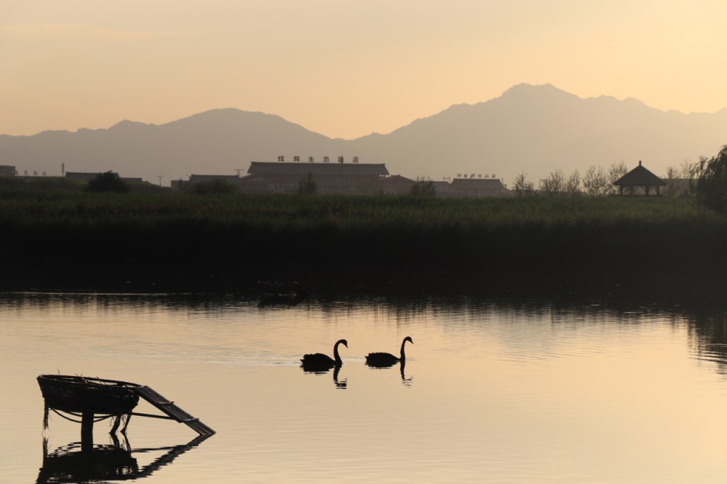 濕地公園佔地廣大,裡頭有許多的步道,要是沒有地圖可能會迷路。公園入口處有雙人或是四人腳踏車可以租借,還有棚子可以遮陽,但是我們想要省錢,而且以為自己很能走。那天的天氣非常炎熱,且有個旅伴前一天在嘉峪關走太多路,最後在濕地公園中腳痛到無法走路,在另外兩人攙扶之下才順利走出公園。濕地公園中自然有許多濕地,也有很多鳥類,藍天映照在水面上很美,最後也有看到日落,簡直就像是水墨畫一般,金色的光芒照射在湖面上,波光粼粼。由於園區實在太大,我們也沒有整個走完,其中有一段路有一些燕鷗一直在頭上飛,然後向下俯衝、作勢攻擊,非常可怕,可能是他們的巢在附近。