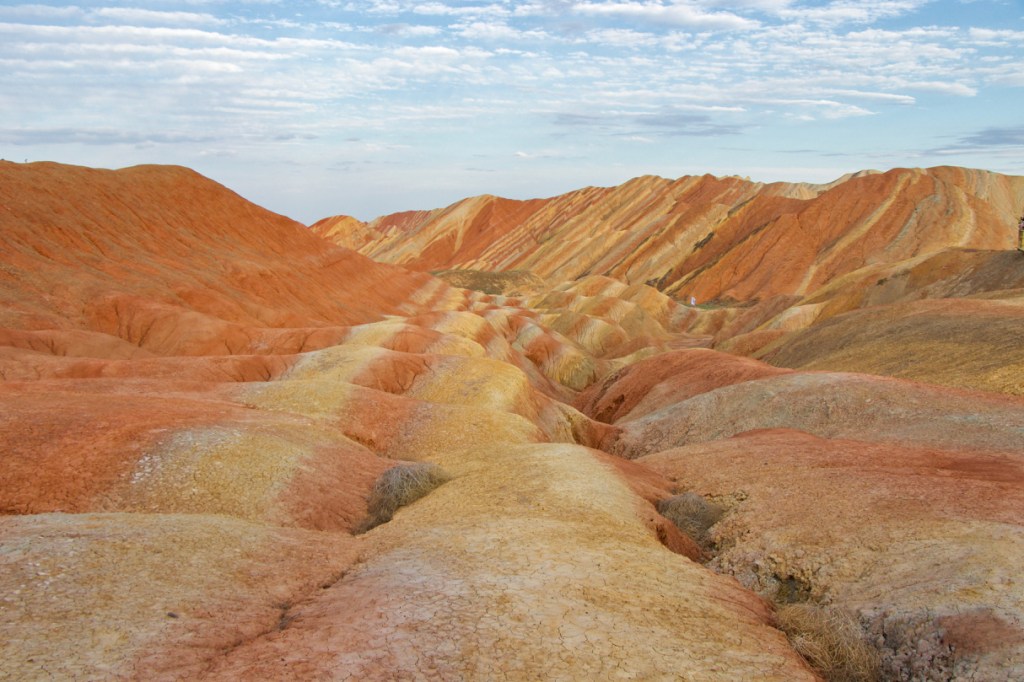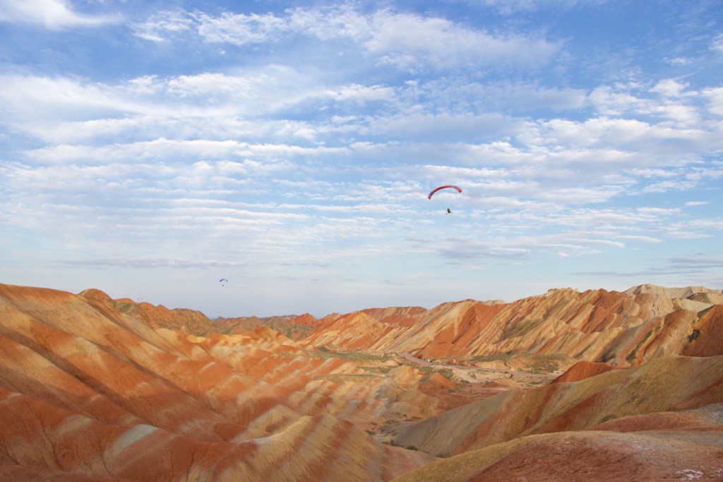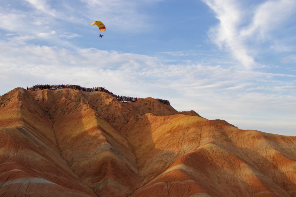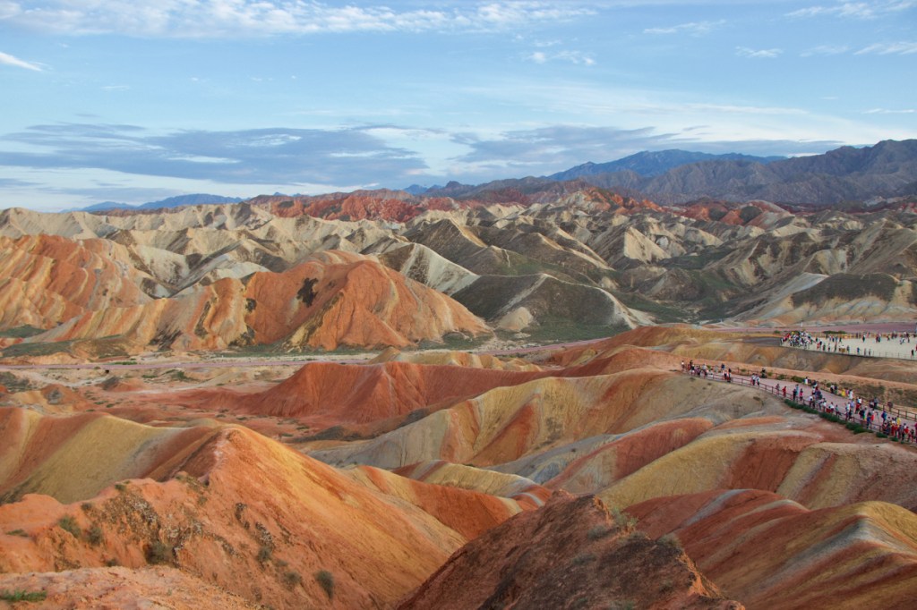 最後一站是著名的七彩丹霞,人非常多,每一個景點都人山人海,在園區內有遊園車可以搭,沒有限制要搭哪一班車。七彩丹霞真的非常美麗,可以看到褶皺,山丘的顏色很特別,有一層一層不同的色彩。在夕陽映照之下,橘紅的色澤更加明顯。園區內還有熱氣球和直升機可以搭乘,但是我們都沒有嘗試。最後一個景點大家都擠著看日落,非常擁擠。